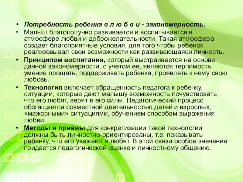 Принципом воспитания, который выстраивается на основе данной закономерности, с учетом ее, являются терпимость, умение прощать, поддерживать ребенка, проявлять к нему свою любовь.