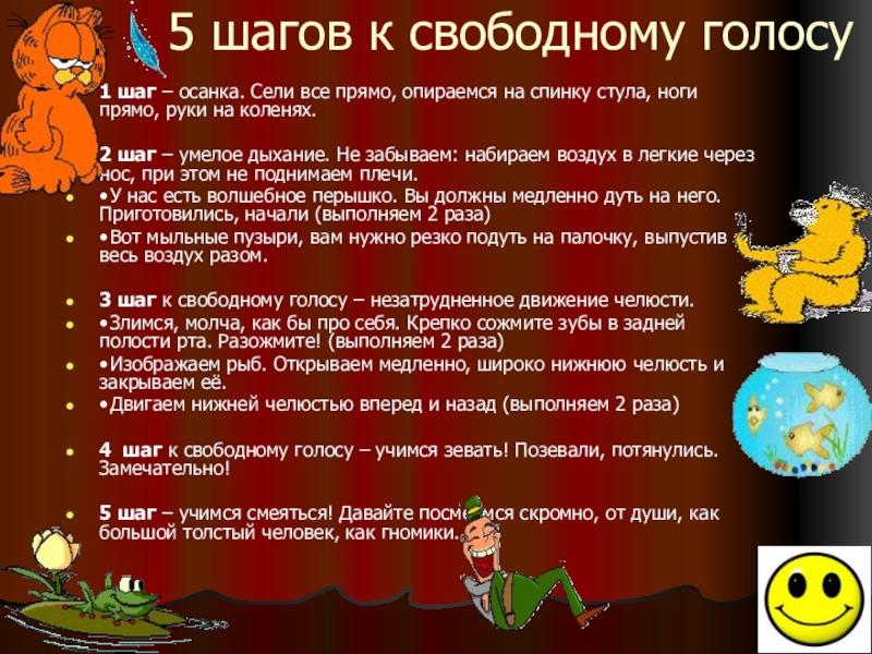 5 шаг – учимся смеяться! Давайте посмеемся скромно, от души, как большой толстый человек, как гномики.