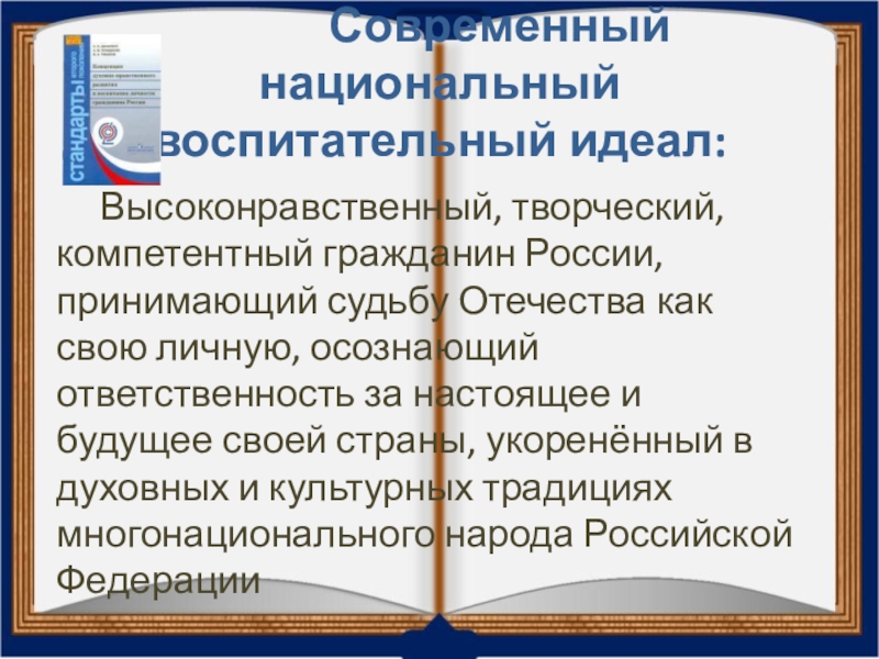 Высоконравственный, творческий, компетентный гражданин России, принимающий судьбу Отечества как свою личную, осознающий ответственность за настоящее и будущее своей страны, укоренённый в духовных и культурных традициях многонационального народа Российской Федерации