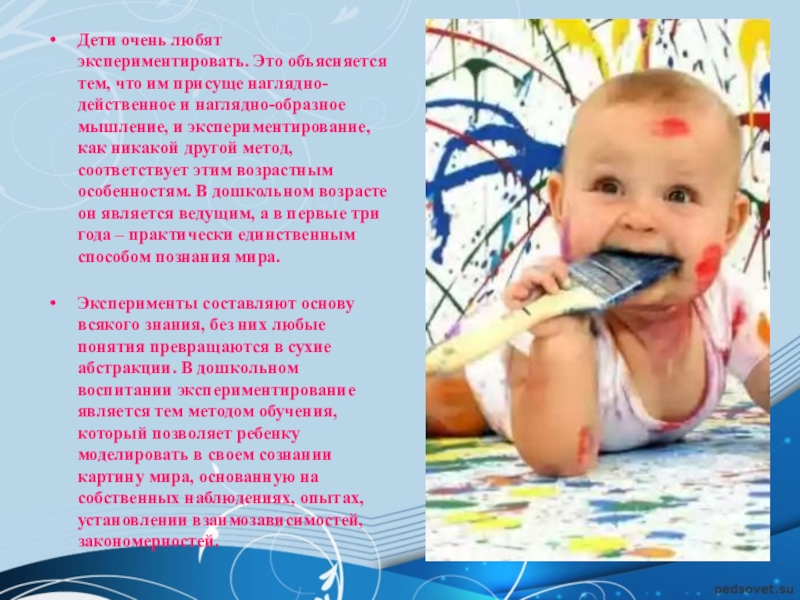 Дети очень любят экспериментировать. Это объясняется тем, что им присуще наглядно-действенное