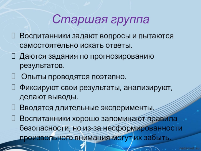 Старшая группаВоспитанники задают вопросы и пытаются самостоятельно искать ответы.Даются задания по прогнозированию результатов. Опыты проводятся поэтапно. Фиксируют