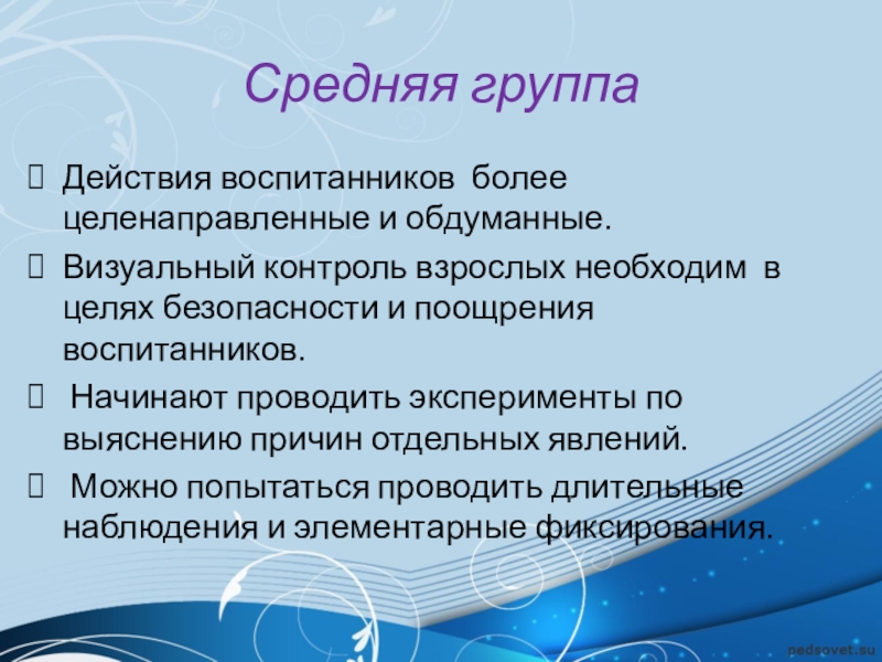 Средняя группаДействия воспитанников более целенаправленные и обдуманные. Визуальный контроль взрослых необходим в целях безопасности и поощрения воспитанников.