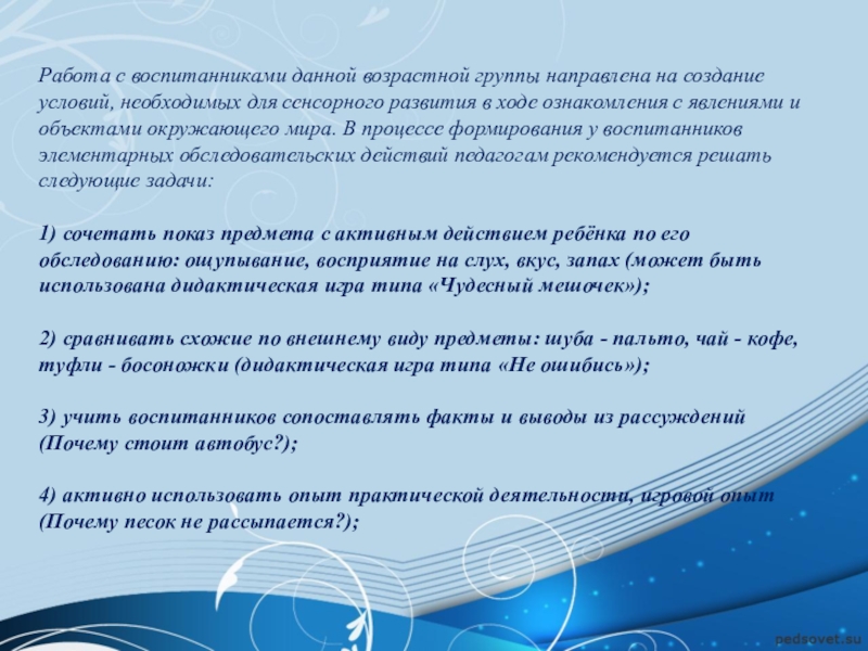 для сенсорного развития в ходе ознакомления с явлениями и объектами окружающего мира. В процессе формирования у воспитанников элементарных обследовательских действий педагогам рекомендуется решать следующие задачи: 1) сочетать показ предмета с активным действием ребёнка по его обследованию: ощупывание, восприятие на слух, вкус, запах (может быть использована дидактическая игра типа «Чудесный мешочек»); 2) сравнивать схожие по внешнему виду предметы: шуба - пальто, чай - кофе, туфли - босоножки (дидактическая игра типа «Не ошибись»); 3) учить воспитанников сопоставлять факты и выводы из рассуждений (Почему стоит автобус?); 4) активно использовать опыт практической деятельности, игровой опыт (Почему песок не рассыпается?);