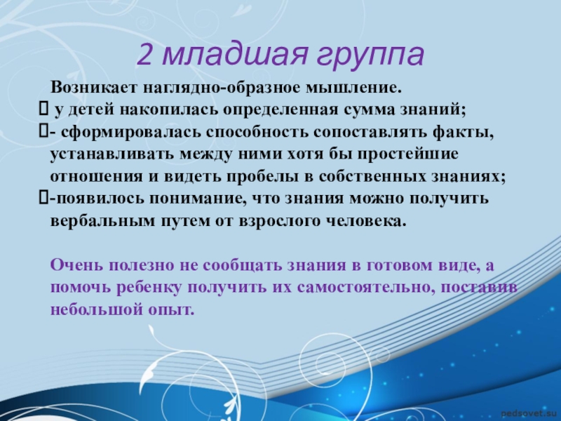 2 младшая группаВозникает наглядно-образное мышление. у детей накопилась определенная сумма знаний;- сформировалась способность сопоставлять факты, устанавливать между