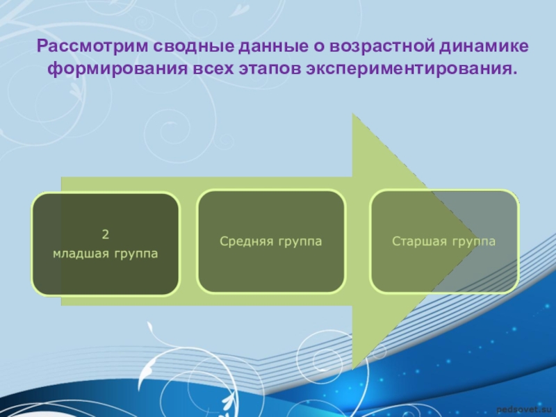 Слайд 7Рассмотрим сводные данные о возрастной динамике формирования всех этапов экспериментирования.