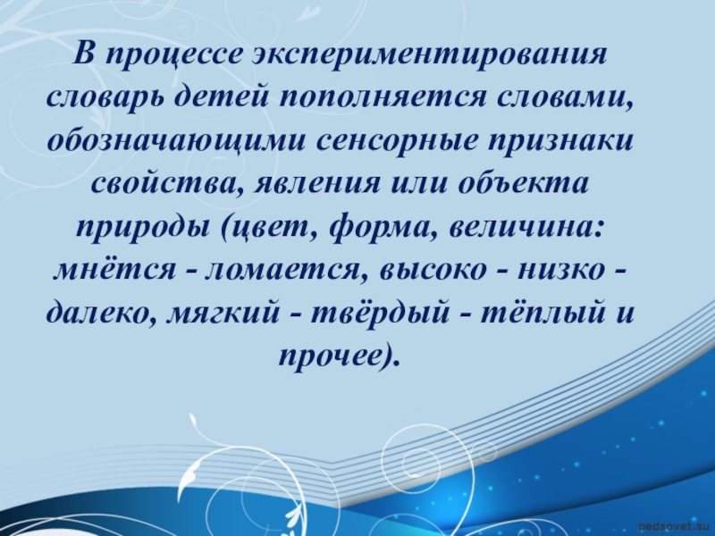 Слайд 10В процессе экспериментирования словарь детей пополняется словами, обозначающими сенсорные признаки свойства,
