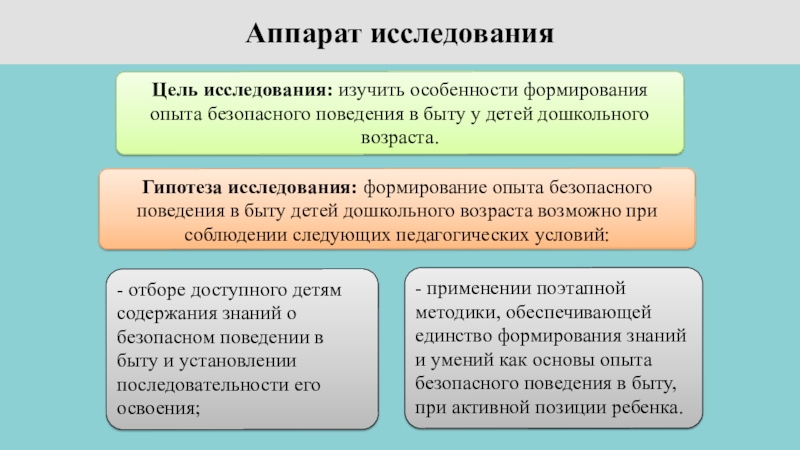Гипотеза исследования: формирование опыта безопасного поведения в быту детей дошкольного возраста возможно при соблюдении следующих педагогических условий: