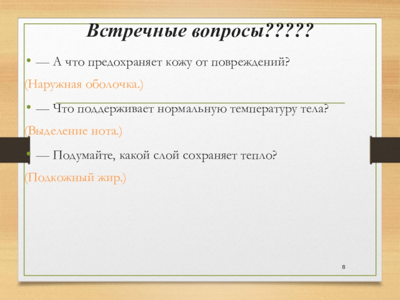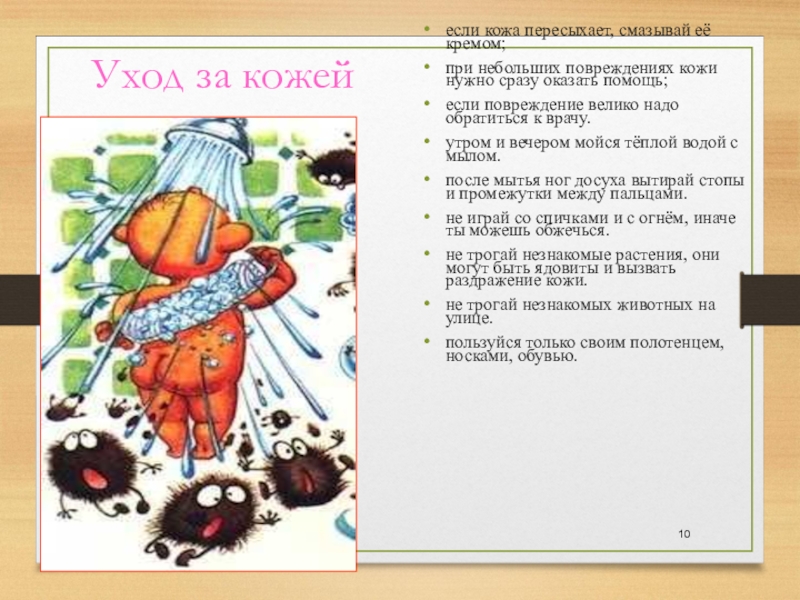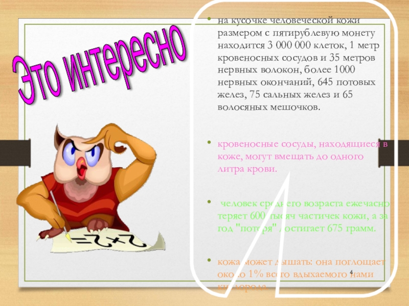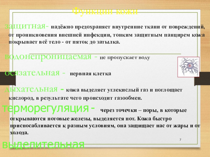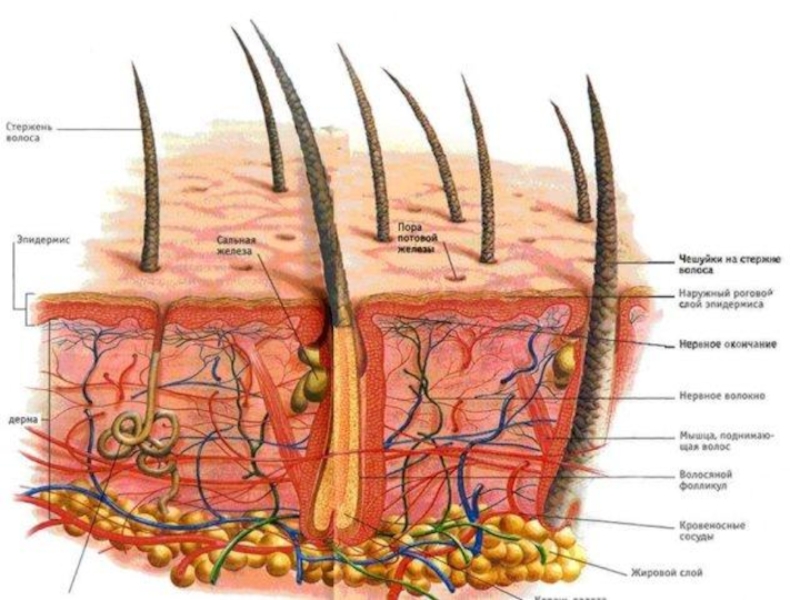 терморегуляция - через точечки – поры, в которые открываются потовые железы, выделяется пот. Кожа быстро приспосабливается к разным условиям, она защищает нас от жары и от холода.