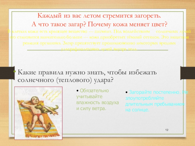 • Загорайте постепенно. Не злоупотребляйте длительным пребыванием на солнце.