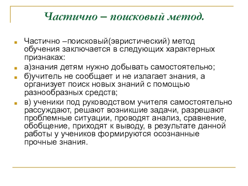 Частично –поисковый(эвристический) метод обучения заключается в следующих характерных