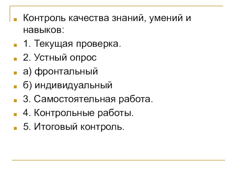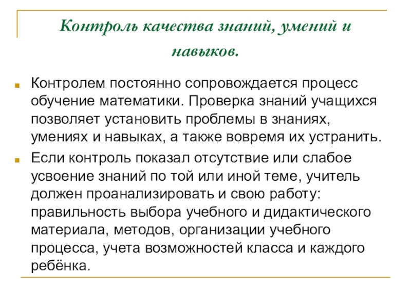 Если контроль показал отсутствие или слабое усвоение знаний по той или иной теме, учитель должен проанализировать и свою работу: правильность выбора учебного и дидактического материала, методов, организации учебного процесса, учета возможностей класса и каждого ребёнка.