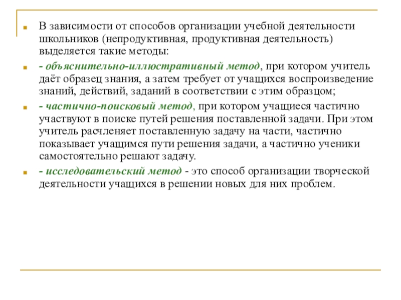 Слайд 4В зависимости от способов организации учебной деятельности школьников (непродуктивная, продуктивная деятельность)