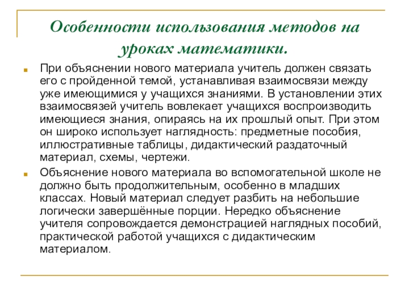 Объяснение нового материала во вспомогательной школе не должно быть продолжительным, особенно в младших классах. Новый материал следует разбить на небольшие логически завершённые порции. Нередко объяснение учителя сопровождается демонстрацией наглядных пособий, практической работой учащихся с дидактическим материалом.