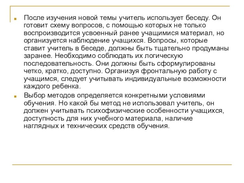 Слайд 6После изучения новой темы учитель использует беседу. Он готовит схему вопросов,
