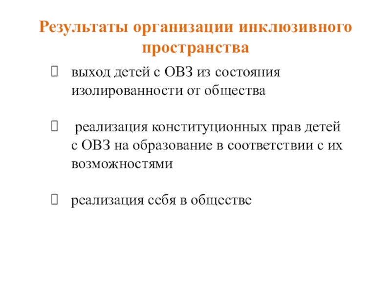 Результаты организации инклюзивного пространствавыход детей с ОВЗ из состояния изолированности от общества реализация конституционных прав детей с