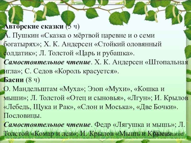 богатырях»; Х. К. Андерсен «Стойкий оловянный солдатик»; Л. Толстой «Царь и рубашка».