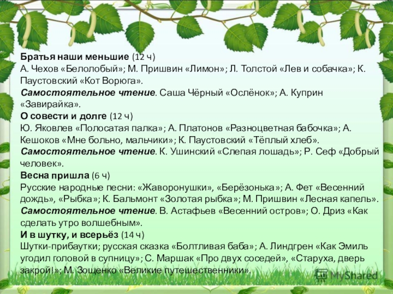 А. Чехов «Белолобый»; М. Пришвин «Лимон»; Л. Толстой