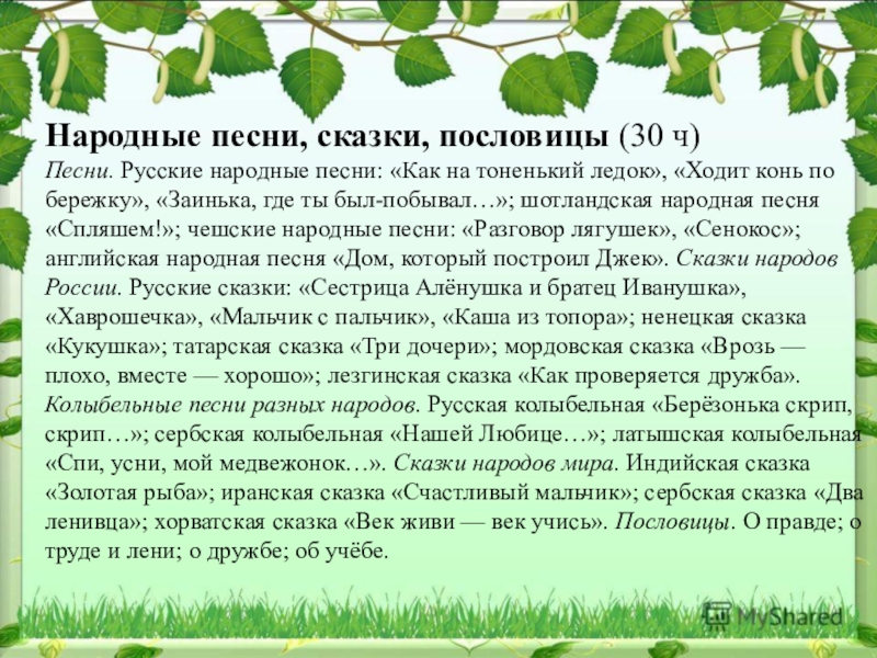 Слайд 14Народные песни, сказки, пословицы (30 ч)