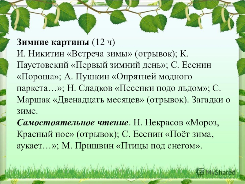 день»; С. Есенин «Пороша»; А. Пушкин «Опрятней модного паркета…»; Н. Сладков «Песенки подо льдом»; С. Маршак «Двенадцать месяцев» (отрывок). Загадки о зиме.