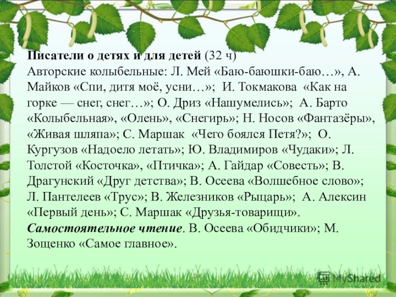 А.Майков «Спи, дитя моё, усни…»; И. Токмакова «Как на горке — снег, снег…»; О. Дриз «Нашумелись»; А. Барто «Колыбельная», «Олень», «Снегирь»; Н. Носов «Фантазёры», «Живая шляпа»; С. Маршак «Чего боялся Петя?»; О. Кургузов «Надоело летать»; Ю. Владимиров «Чудаки»; Л. Толстой «Косточка», «Птичка»; А. Гайдар «Совесть»; В. Драгунский «Друг детства»; В. Осеева «Волшебное слово»; Л. Пантелеев «Трус»; В. Железников «Рыцарь»; А. Алексин «Первый день»; С. Маршак «Друзья-товарищи».