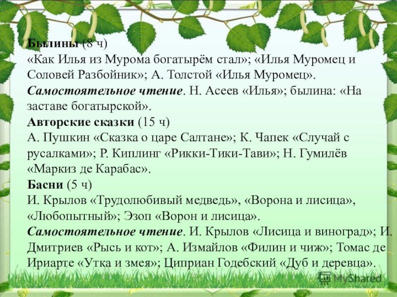 Самостоятельное чтение. И. Крылов «Лисица и виноград»; И. Дмитриев «Рысь и кот»; А. Измайлов «Филин и чиж»; Томас де Ириарте «Утка и змея»; Циприан Годебский «Дуб и деревца».