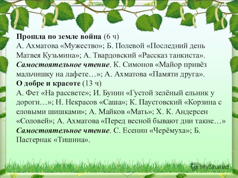 Суриков «Степь»; И. Соколов-Микитов «Вертушинка»; О. Дриз «Кончилось лето». Здравствуй, осень (6 ч) М. Пришвин «Полянка в лесу»; А. Майков «Осень»; А. Пушкин «Уж небо осенью дышало…»; К. Паустовский «Прощание с летом».