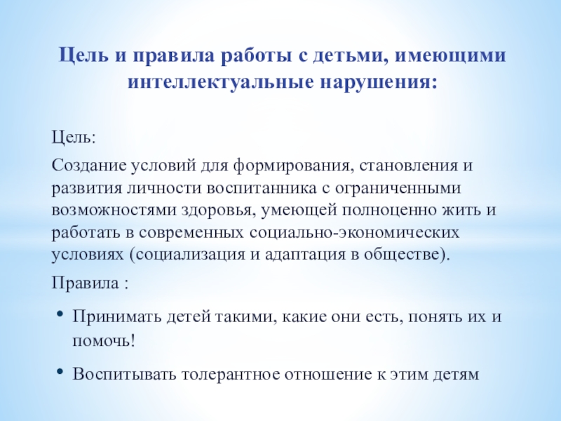 Слайд 10Цель и правила работы с детьми, имеющими интеллектуальные нарушения: