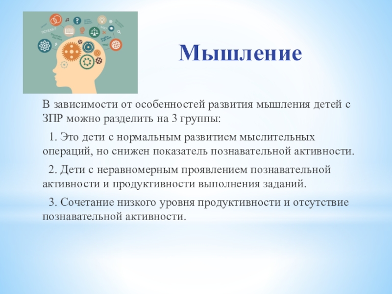 Слайд 8В зависимости от особенностей развития мышления детей с ЗПР можно разделить
