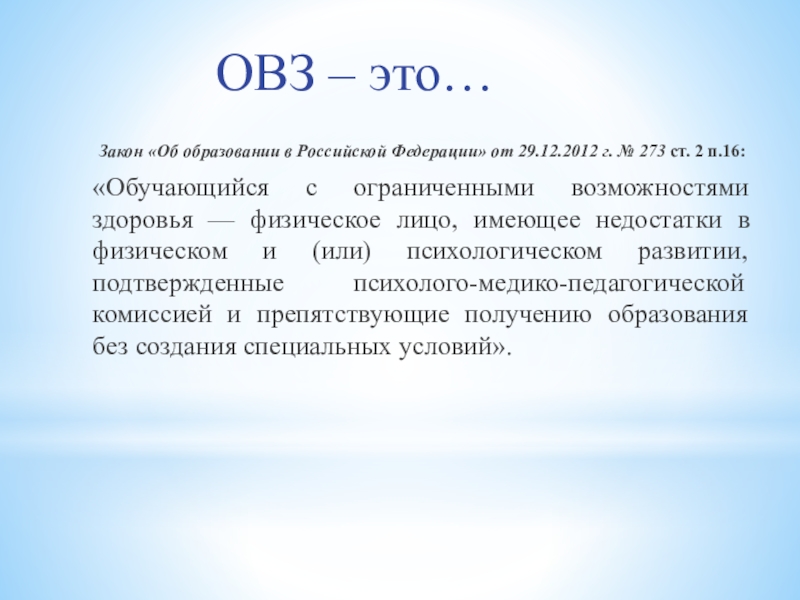 «Обучающийся с ограниченными возможностями здоровья — физическое лицо, имеющее недостатки в физическом и (или) психологическом развитии, подтвержденные психолого-медико-педагогической комиссией и препятствующие получению образования без создания специальных условий».