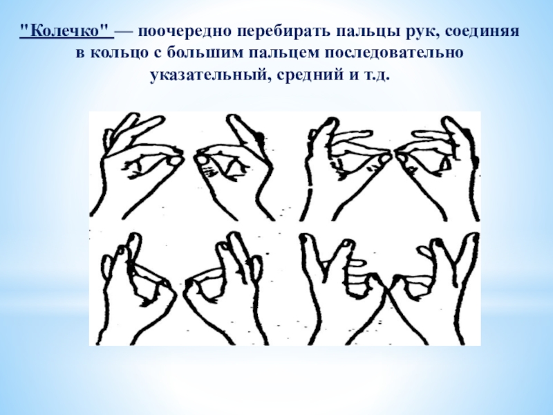 Слайд 18"Колечко" — поочередно перебирать пальцы рук, соединяя в кольцо с большим