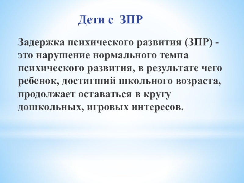 Слайд 5Задержка психического развития (ЗПР) - это нарушение нормального темпа психического развития,