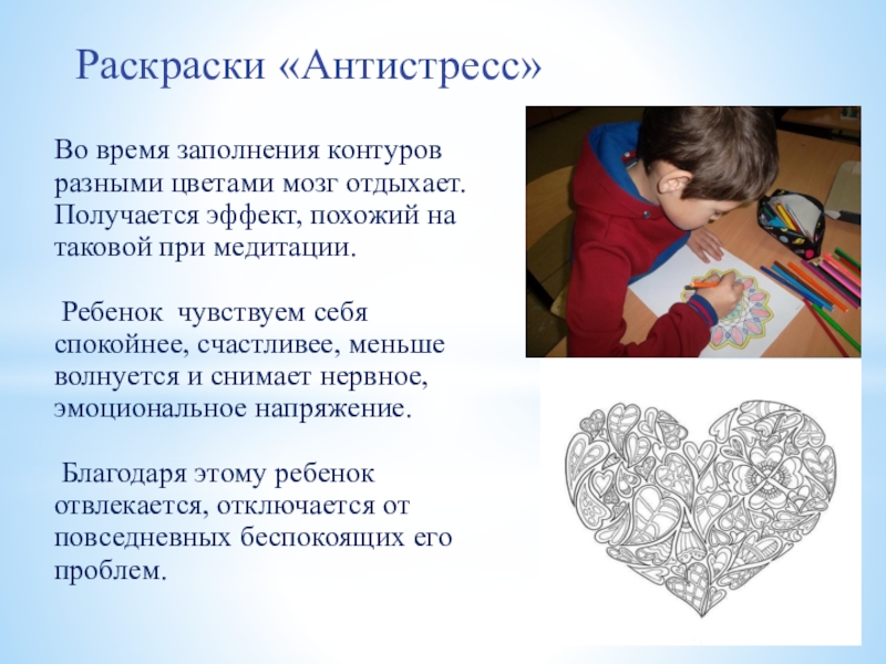 Слайд 26Во время заполнения контуров разными цветами мозг отдыхает. Получается эффект, похожий