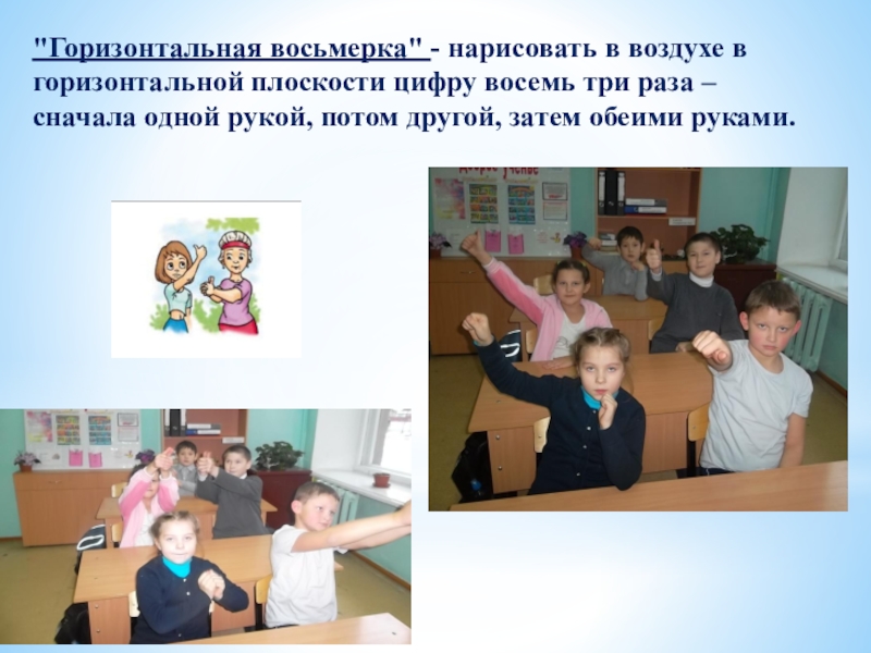 Слайд 21"Горизонтальная восьмерка" - нарисовать в воздухе в горизонтальной плоскости цифру восемь
