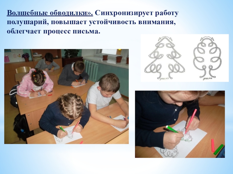 Слайд 24Волшебные обводилки». Синхронизирует работу полушарий, повышает устойчивость внимания, облегчает процесс письма.