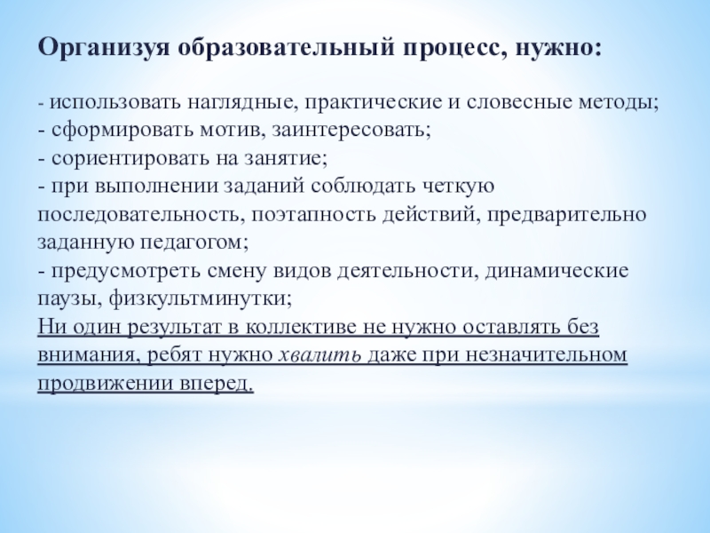 Ни один результат в коллективе не нужно оставлять без внимания, ребят нужно хвалить даже при незначительном продвижении вперед.