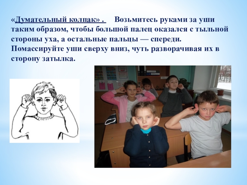Слайд 22«Думательный колпак» . Возьмитесь руками за уши таким образом,