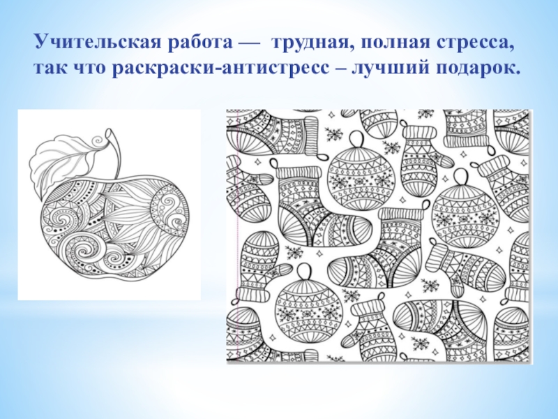 Слайд 27Учительская работа — трудная, полная стресса, так что раскраски-антистресс – лучший
