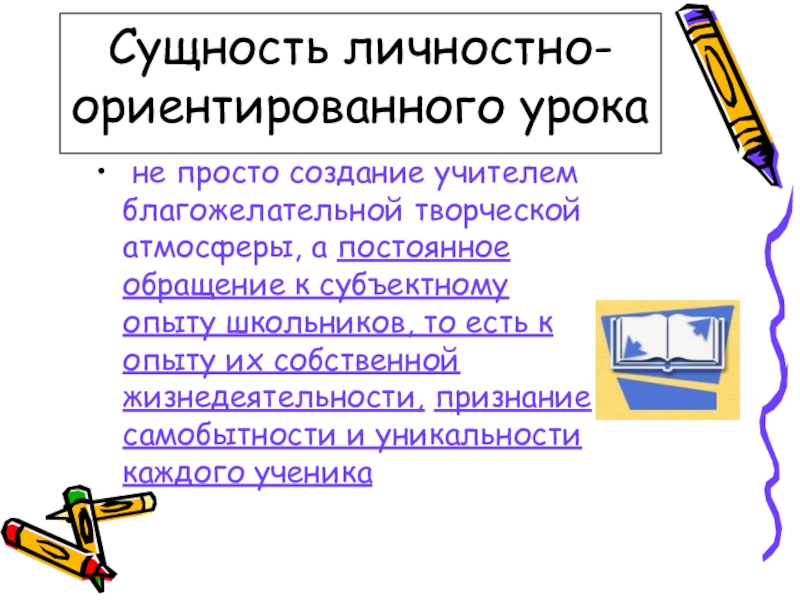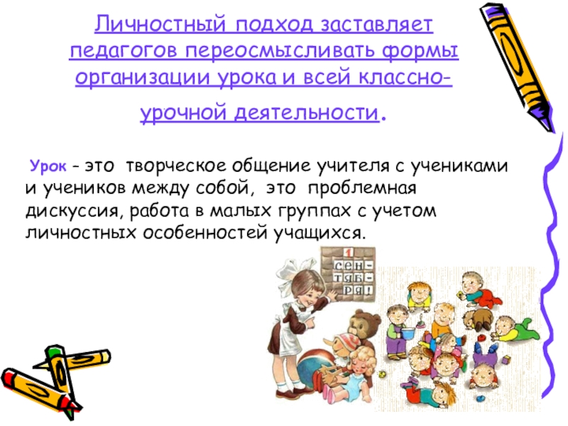Урок – это творческое общение учителя с учениками и учеников между собой, это проблемная дискуссия, работа в малых группах с учетом личностных особенностей учащихся.