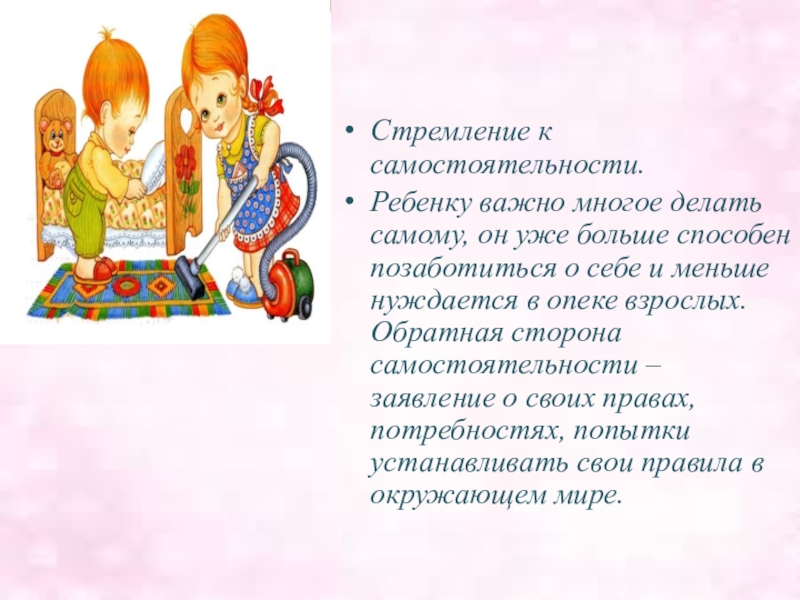 Стремление к самостоятельности.Ребенку важно многое делать самому, он уже больше способен позаботиться о себе и меньше нуждается