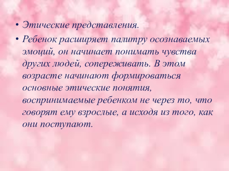 Этические представления.Ребенок расширяет палитру осознаваемых эмоций, он начинает понимать чувства других людей, сопереживать. В этом возрасте начинают