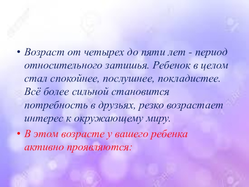 Слайд 2Возраст от четырех до пяти лет - период относительного затишья. Ребенок