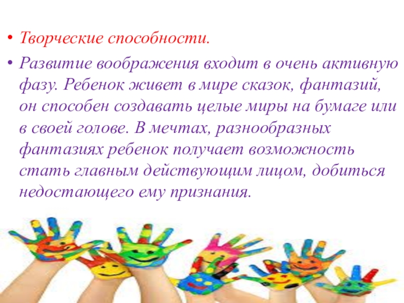 Творческие способности.Развитие воображения входит в очень активную фазу. Ребенок живет в мире сказок, фантазий, он способен создавать