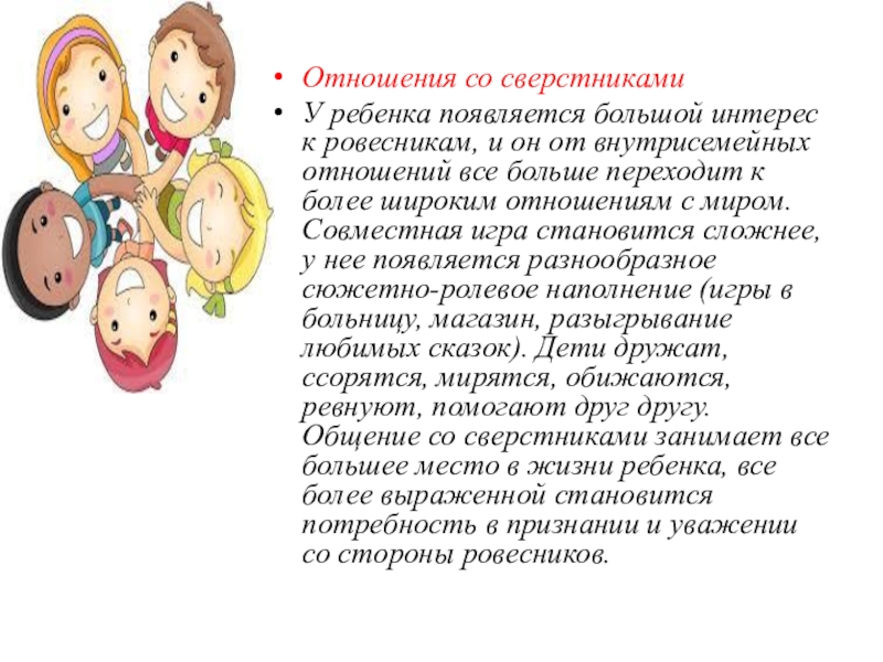 от внутрисемейных отношений все больше переходит к более широким отношениям с миром. Совместная игра становится сложнее, у нее появляется разнообразное сюжетно-ролевое наполнение (игры в больницу, магазин, разыгрывание любимых сказок). Дети дружат, ссорятся, мирятся, обижаются, ревнуют, помогают друг другу. Общение со сверстниками занимает все большее место в жизни ребенка, все более выраженной становится потребность в признании и уважении со стороны ровесников.
