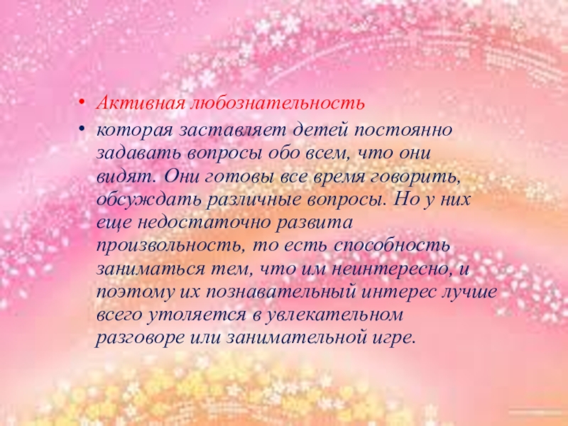 видят. Они готовы все время говорить, обсуждать различные вопросы. Но у них еще недостаточно развита произвольность, то есть способность заниматься тем, что им неинтересно, и поэтому их познавательный интерес лучше всего утоляется в увлекательном разговоре или занимательной игре.