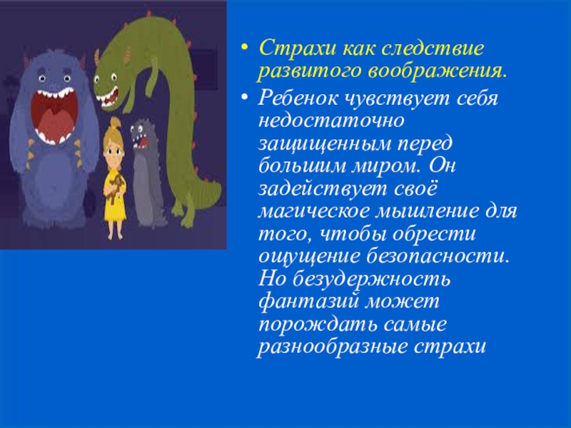 Страхи как следствие развитого воображения.Ребенок чувствует себя недостаточно защищенным перед большим миром. Он задействует своё магическое мышление