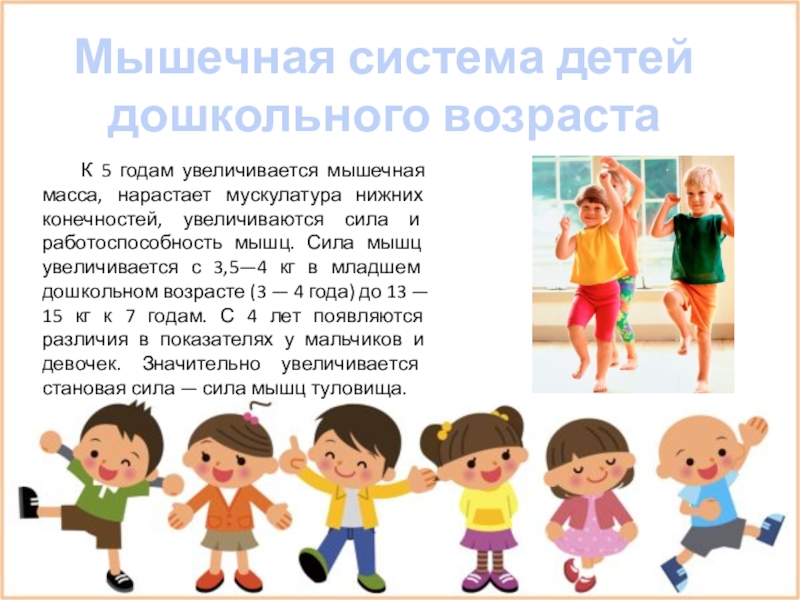 нарастает мускулатура нижних конечностей, увеличиваются сила и работоспособность мышц. Сила мышц увеличивается с 3,5—4 кг в младшем дошкольном возрасте (3 — 4 года) до 13 — 15 кг к 7 годам. С 4 лет появляются различия в показателях у мальчиков и девочек. Значительно увеличивается становая сила — сила мышц туловища.