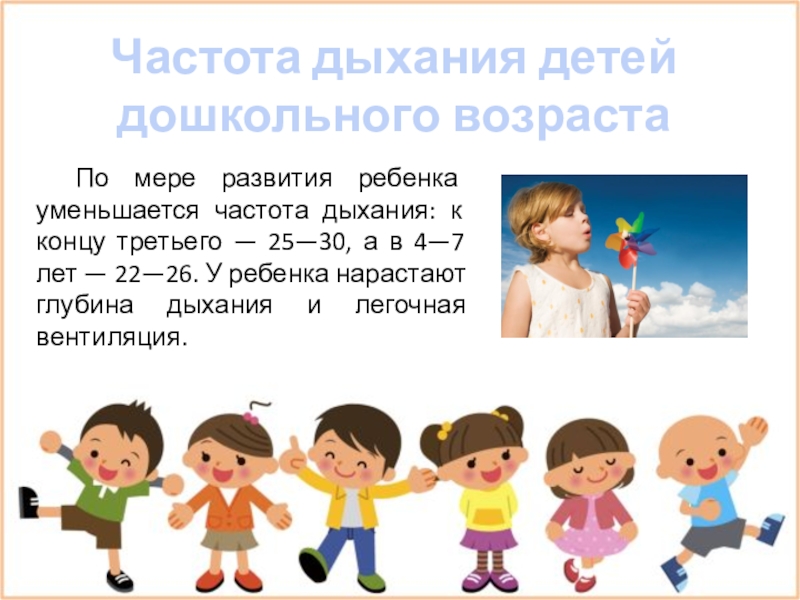 дыхания: к концу третьего — 25—30, а в 4—7 лет — 22—26. У ребенка нарастают глубина дыхания и легочная вентиляция.