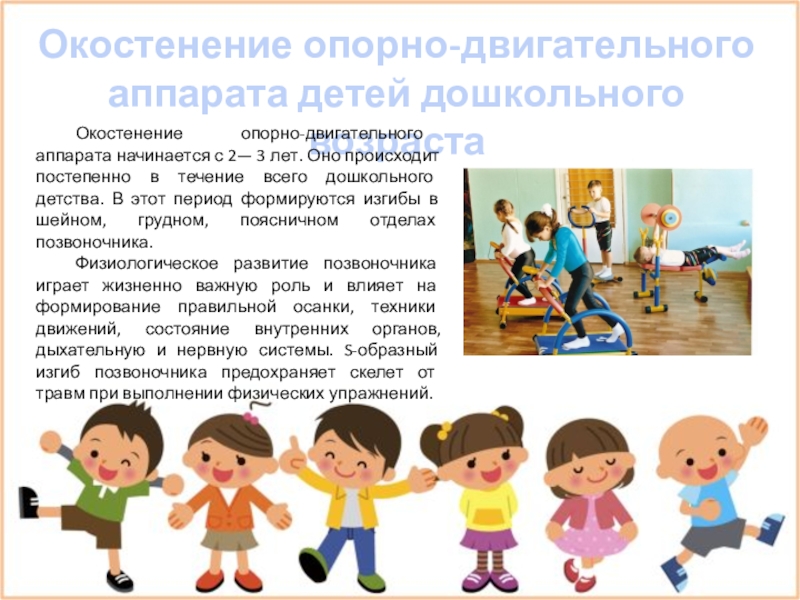 2— 3 лет. Оно происходит постепенно в течение всего дошкольного детства. В этот период формируются изгибы в шейном, грудном, поясничном отделах позвоночника.