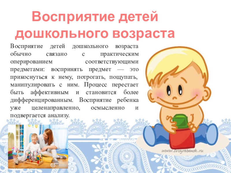 практическим оперированием соответствующими предметами: воспринять предмет — это прикоснуться к нему, потрогать, пощупать, манипулировать с ним. Процесс перестает быть аффективным и становится более дифференцированным. Восприятие ребенка уже целенаправленно, осмысленно и подвергается анализу.