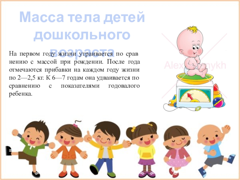 сравнению с массой при рождении. После года отмечаются прибавки на каждом году жизни по 2—2,5 кг. К 6—7 годам она удваивается по сравнению с показателями годовалого ребенка.